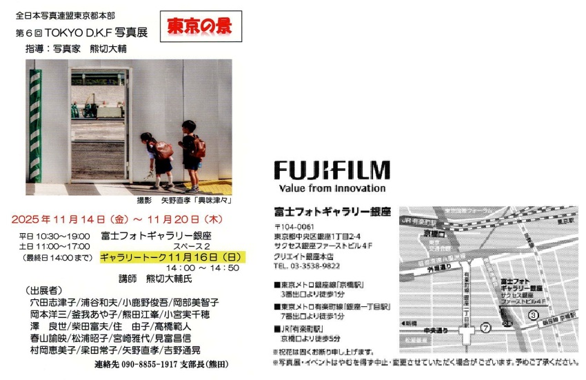 第6回 TOKYO D.K.F 写真展「東京の景」 イベント 2025.09.22 期間:11月14日(金)~11月20日(木)場所:富士フォトギャラリー銀座 スペース2 写真家 熊切大輔氏に指導を受ける支部の写真展です。写真向上のために「コンテスト」という目標意識を持ち勉強する支部です。