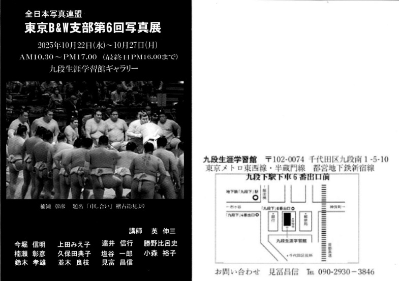 東京B&W支部 第6回写真展 イベント 2025.09.22 期間:10月22日(水)~10月27日(月)場所:九段生涯学習館ギャラリー 写真家 英 伸三氏に指導を受ける支部の写真展です。支部名のB&Wは「BLACK and WHITE」で、モノクロ写真に特化して活動する支部です。