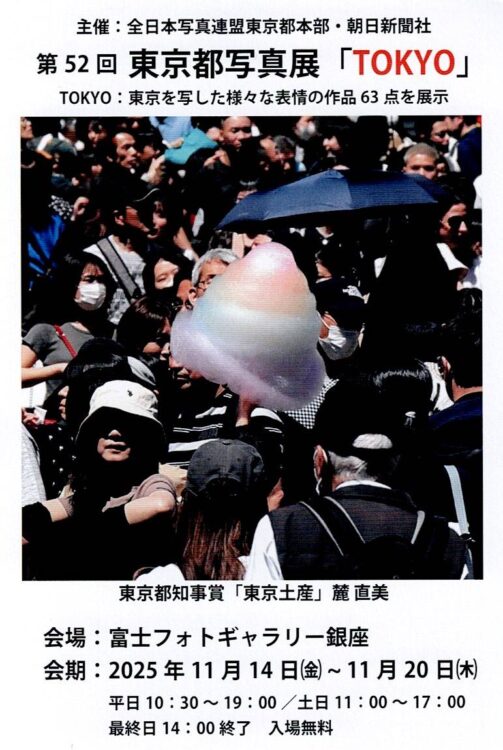 7月1日~9月5日まで募集した第52回東京都写真展で、山口規子氏の審査で選ばれた63点の入賞・入選作品が一堂に会した写真展を下記の通り11月14日(金)から始まります。「TOKYO」をテーマに写した様々な表情をご覧いただけますので、ぜひ足をお運びください。